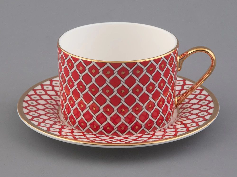 Чашка с блюдцем «Скарлетт» отличаются изысканным декором, представляющим собой современную вариацию на тему знаменитой росписи Императорского фарфорового завода «Кобальтовая сетка», прототипом которой, в свою очередь, является Собственный сервиз Елизаветы Петровны середины XVIII века.