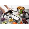 - Регулируемая толщина и форма нарезки: ломтики от 1 до 9 мм, брусочки шириной 4,5 и 9 мм.