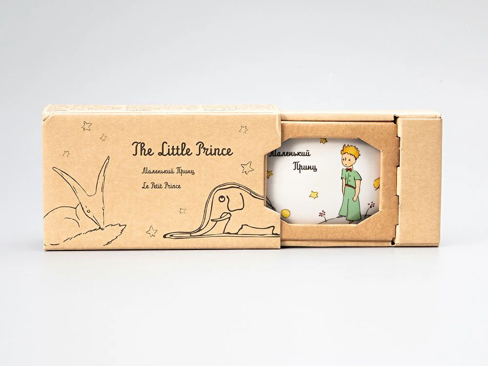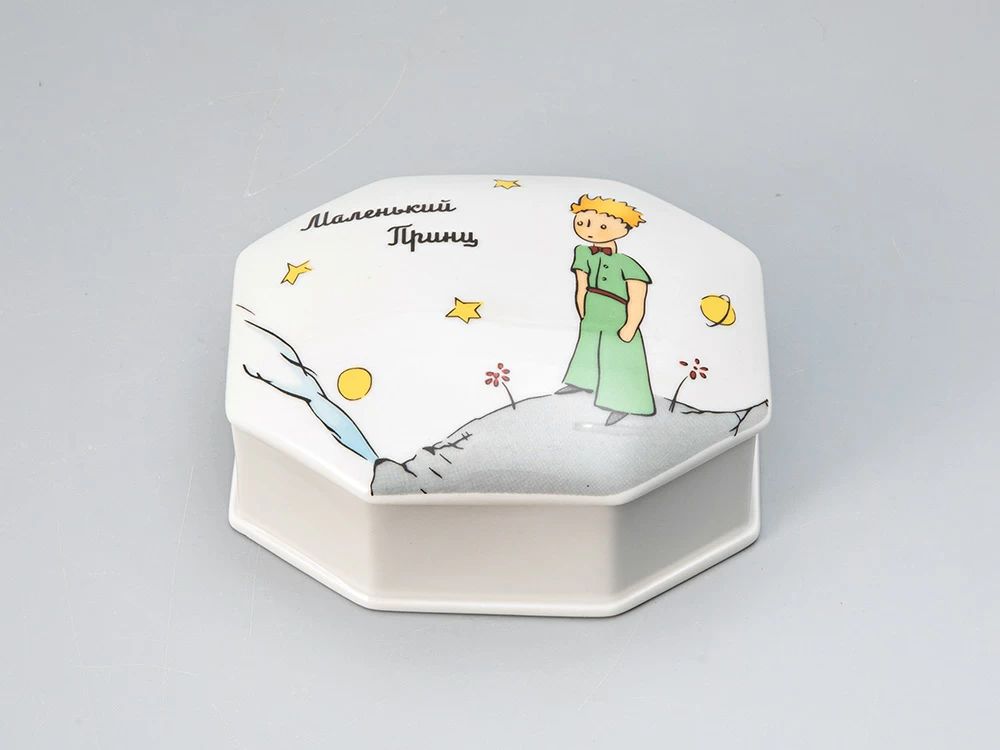 На крышке туалетной коробочки изображен Маленький принц, по мотивам рисунков А. де Сент Экзюпери. По тулову коробочки с одной стороны цитата из произведения Маленький принц.